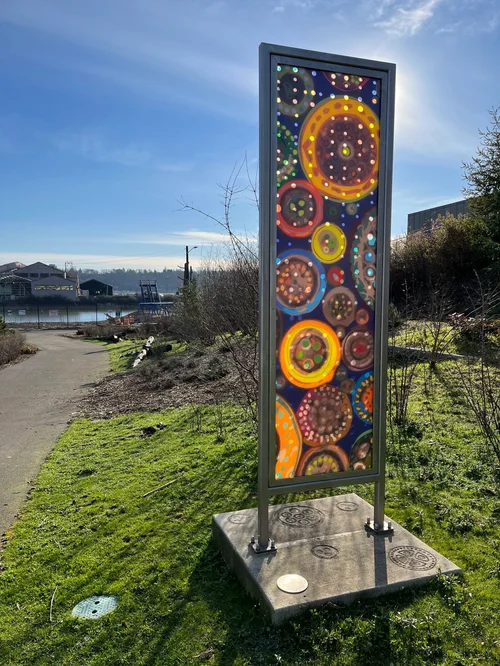 Significant thematic threads connect Conduit to Seattle City Light’s T-117 Adjacent Streets Project and the mission of its Green Initiative. The translucent grid that lights up with direct sunlight that is seen in the vertical sculpture illuminates the infrastructure Seattle City Light supports, and references the woven fishing weirs historically used by the Duwamish people on this river. Circular patterns in the artwork elements located throughout the site illustrate cut ends of high voltage cables and suggest both interconnected strands of community bound together and the constant flow of energy. Colors and surface treatment of this sculpture, the stamped sidewalk and cast benches along South Donovan Street also underscore water’s central role as the primary energy source for Seattle City Light, and the natural meander of the original path of the Duwamish River.